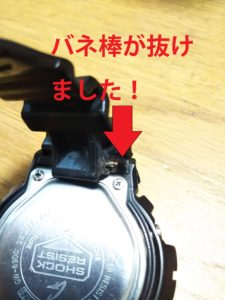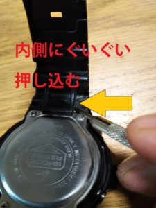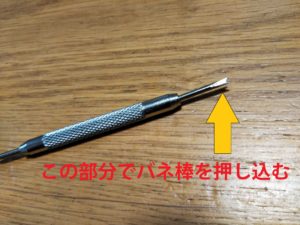 で、ベルトの外し方ですが、チラ見えしているバネ棒を専用工具または小さめのマイナスドライバーなどを使ってグイグイ内側に押します。