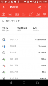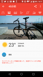 上の写真にはありませんが、走行の軌跡が地図上に表示されます。そして上の写真のとおり、走行距離・走行時間・平均速度・最高速度・消費カロリーなど、クロスバイクに乗った結果として、ワタシが知りたい情報のほとんどが記録されます。